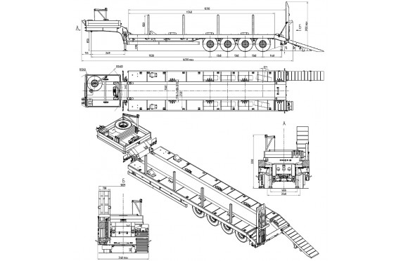 58500 кг, шины 395/85R20 или 445/65R22,5 / 8+1, платформа 9280 (10142 до трапов) x 3000 с уширителями до 3505 мм, ССУ 1550 мм, рессорная подвеска