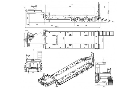 47000 кг, шины 445/65R22.5 или 395/85R20 / 6+1, платформа 9300 (10300 до трапов) x 2500 с уширителями до 3000 мм, механические трапы, пневматическая подвеска, съемные стойки 1500 мм