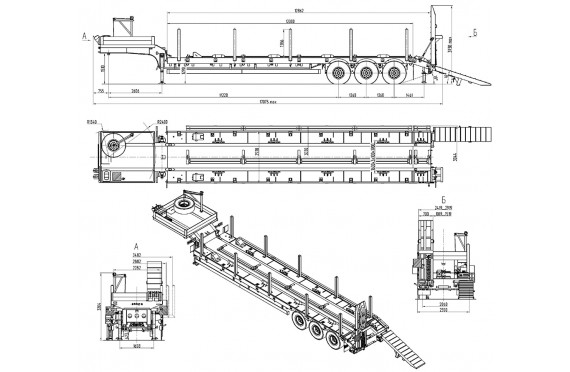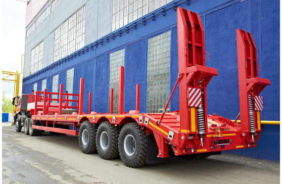 45000 кг, шины 445/65R22,5 или 395/85R20 / 6+1, платформа 10300 (11080 до трапов) x 2500 с уширителями до 3000 мм, механические трапы, ССУ 1510 мм, рессорная подвеска, съемные стойки 1500 мм