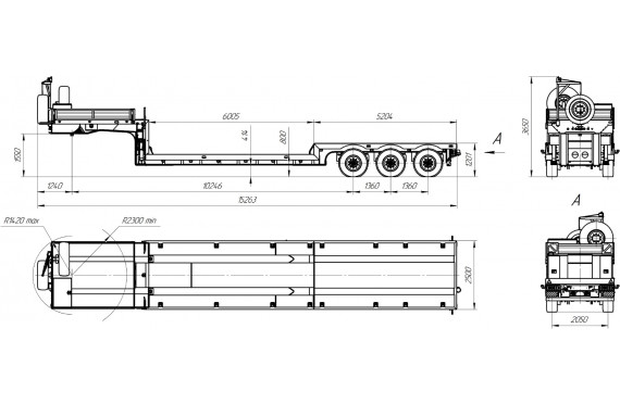 45000 кг, шины 445/65R22,5 или 395/85R20 / 6+1, платформа без трапов6005 мм, погрузочная высота 800 мм, ССУ 1530 мм, пневматическая или рессорная подвеска