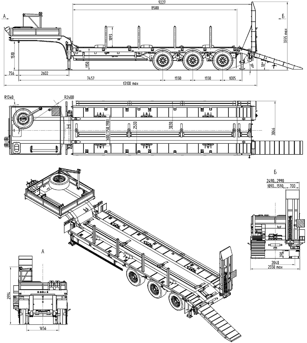 33500 кг, шины 385/65R22,5/6+1, платформа 8500 (9227 до трапов) x 2530 с уширителями до 3030 мм, ССУ 1510 мм, рессорная или пневматическая подвеска, съемные стойки