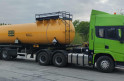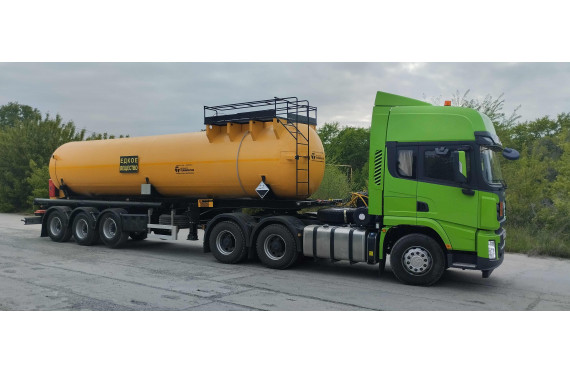 Материал: химстойкое стекловолокно, емкость: 22,5; утепленная, перевозимые жидкости: кислоты/едкие вещества/нефть/техвода/щелочные и солевые растворы, автошины 385/65R22,5; передняя ось - подъемная